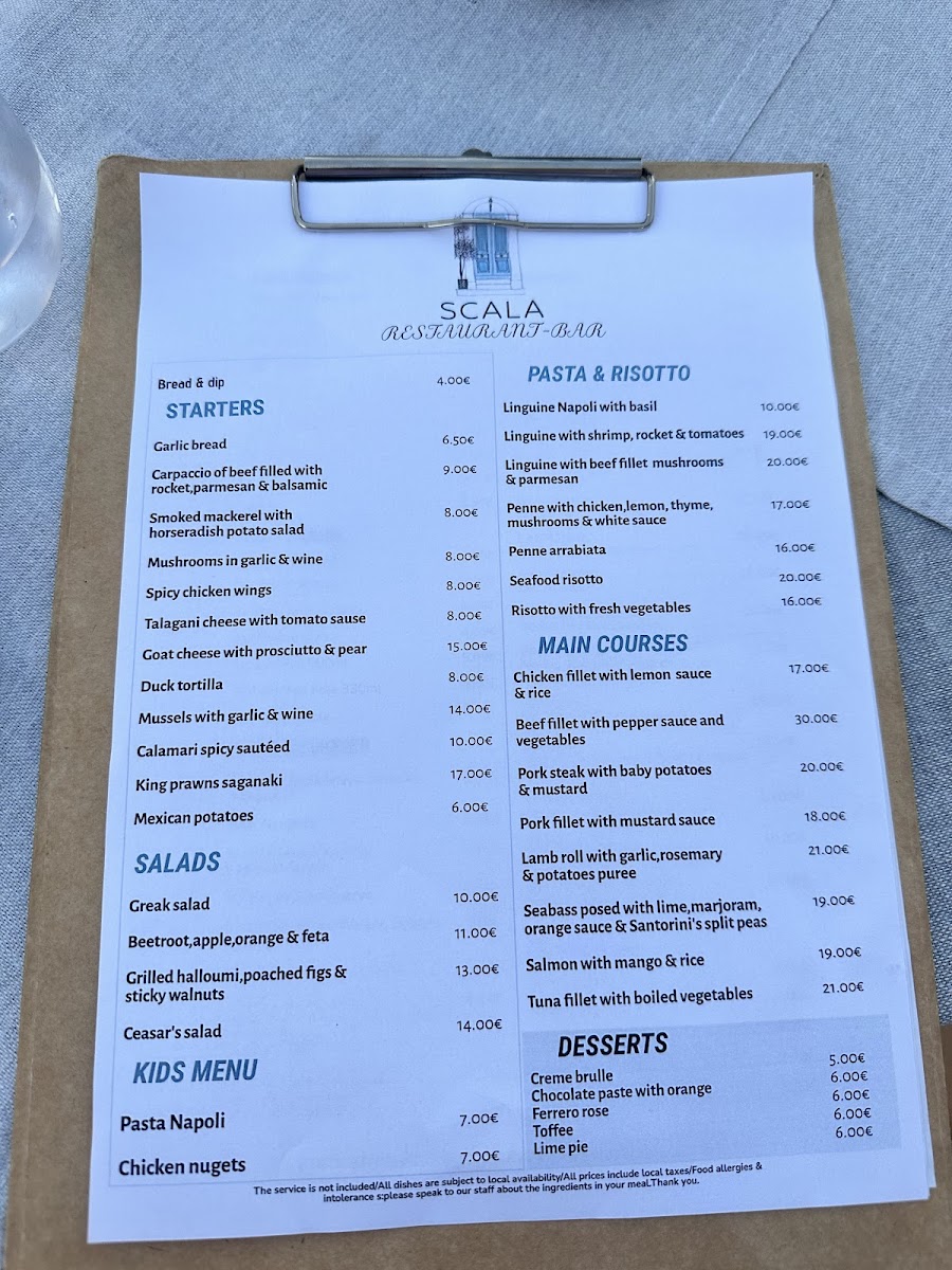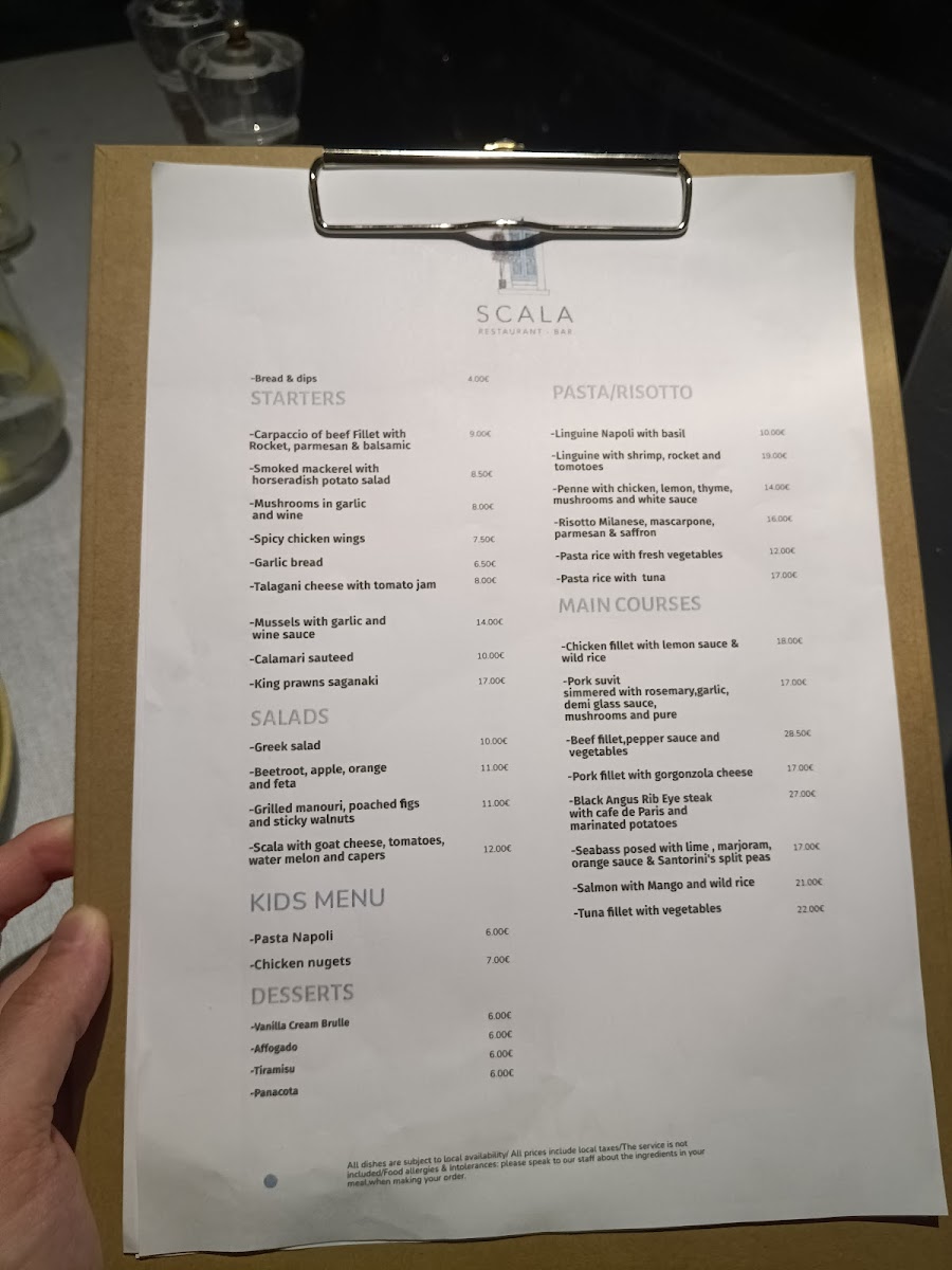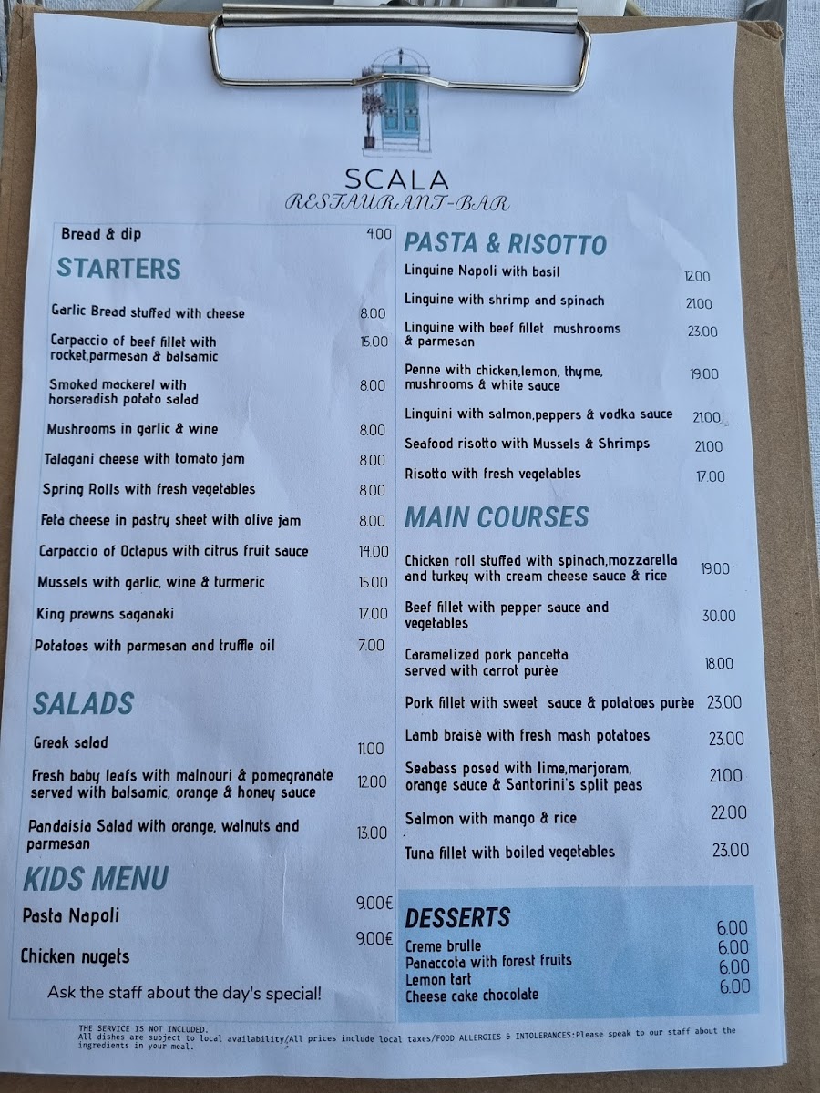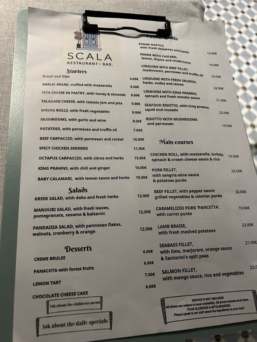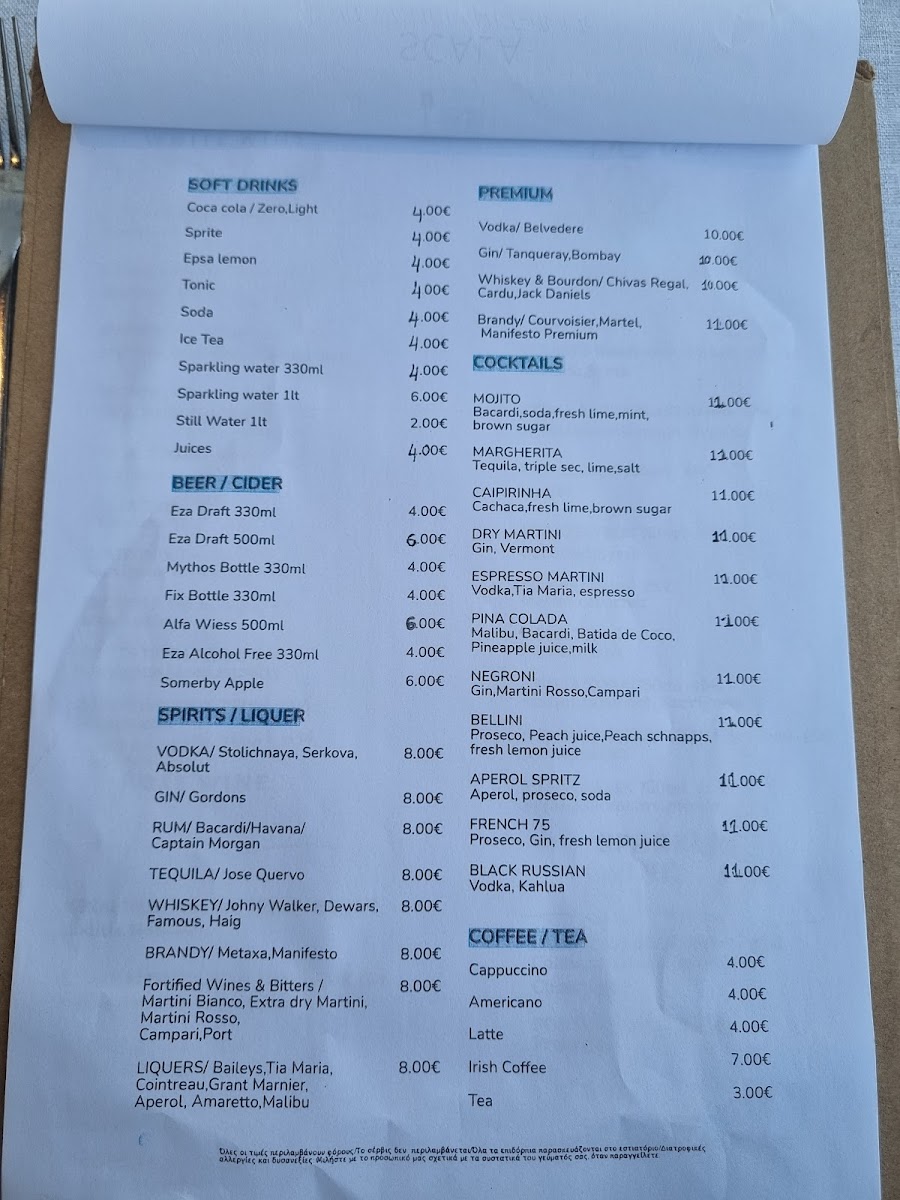 The drink menu is also worth noting, with refreshing options like Prosecco, adding a bubbly touch to your dining experience. With its variety of dishes and high-quality ingredients, Scala Restaurant Bar in Skiathos offers a memorable and diverse dining experience.